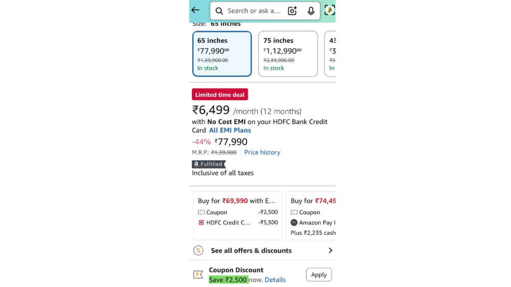 Besides the coupon discount up to Rs 2,500, you can also avail of bank discounts. For instance, with the HDFC Bank Credit Card, you can avail up to a Rs 5,500 discount. Here’s the deal breakdown for different sizes of Bravia 2M2: