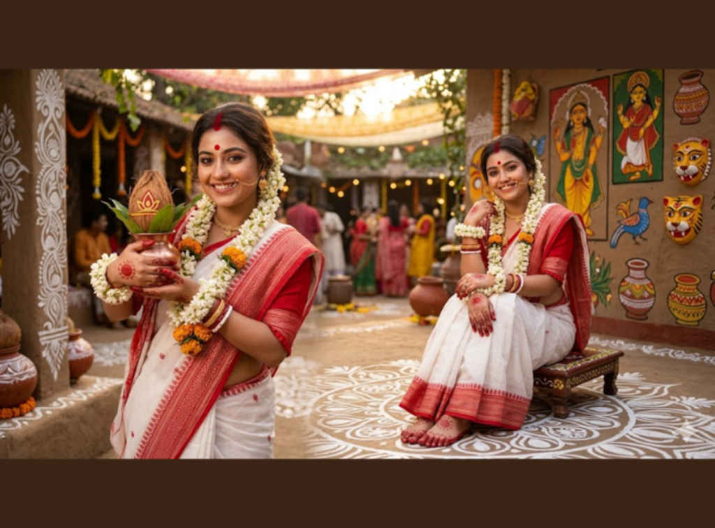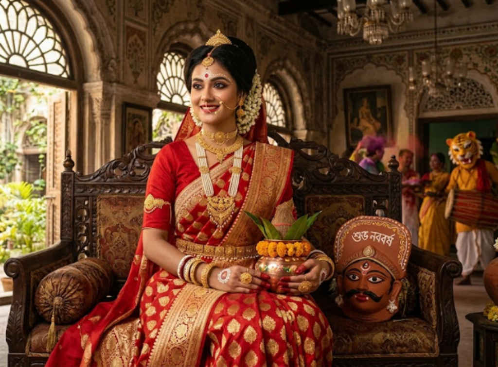 A beautiful Bengali woman wearing red and white saree, traditional Pohela Boishakh look, floral garland, alta on hands, soft golden lighting, cultural background with alpana and folk art, ultra realistic, 4K