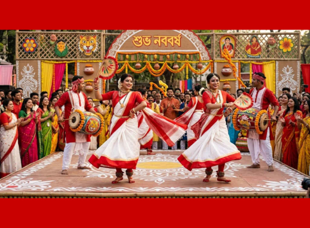 Bengali folk dance performance on Pohela Boishakh, dancers in traditional attire, energetic movement, colorful stage, festive environment, dynamic composition