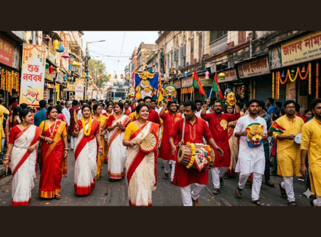 Street photography style Pohela Boishakh celebration in Kolkata/Dhaka, people walking in traditional attire, candid moments, vibrant colors, realistic photography style
