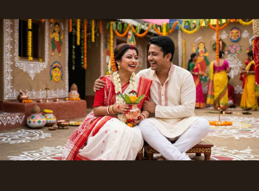 A Bengali couple celebrating Pohela Boishakh, both wearing traditional red and white outfits, smiling, decorated background with alpana and flowers, soft focus, DSLR quality