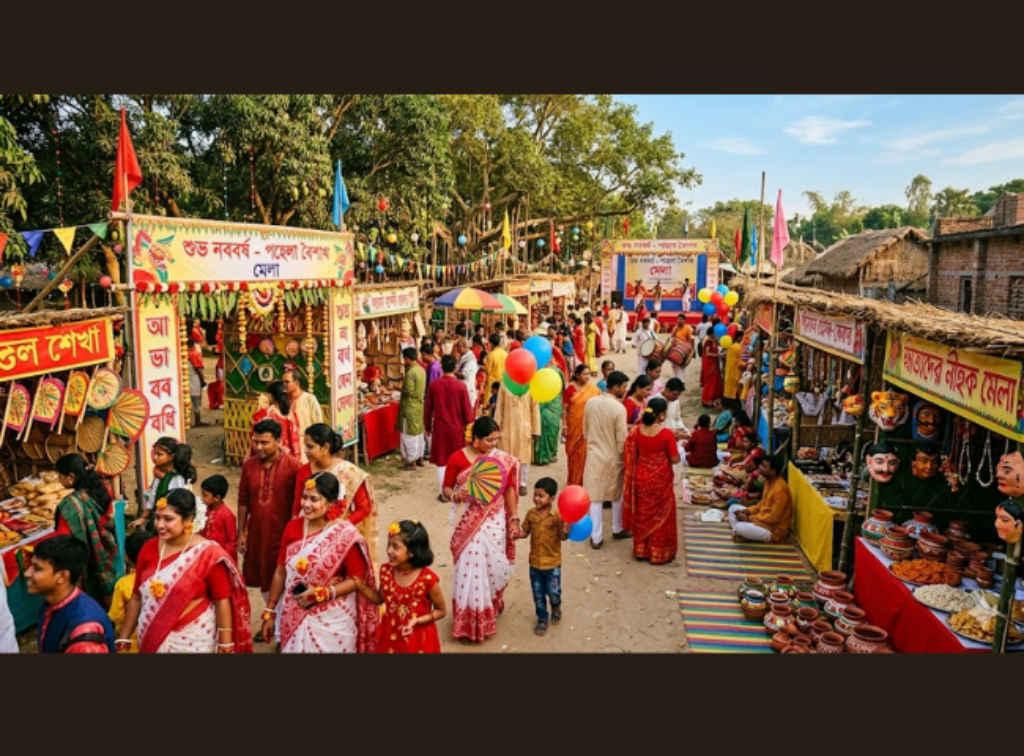 A vibrant Pohela Boishakh fair scene, colorful stalls, people in traditional outfits, hand fans, balloons, rural Bengali festival vibe, warm sunlight, cinematic shot