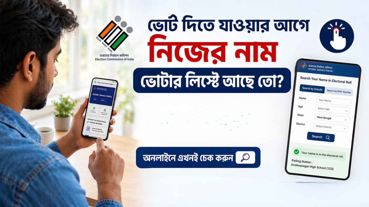 West Bengal Election 2026 Voter List Name how to Check: পশ্চিমবঙ্গে বিধানসভা নির্বাচনের প্রথম দফার ভোট গতকাল 23 এপ্রিল হয় গেছে। ইতিমধ্যে 29 এপ্রিল দ্বিতীয় দফার ভোটের প্রস্তুতি নিতে শুরু করে দিয়েছে নির্বাচন কমিশন। এমন সময় ভোট দিতে যাওয়ার আগে ভোটার তালিকায় নিজের আছে কিনা তা যাচাই করে নেওয়া উচিত। আপনি ভোটার কার্ড বা EPIC নম্বরের সাহায্যে খুব সহজেই অনলাইনে যাচাই করে নিতে পারেন। আপনি বাড়িতে বসেই স্মার্টফোন বা কম্পিউটারের মাধ্যমে এই কাজটি করতে পারেন। তবে বলে দি যে এই প্রক্রিয়াটি পুরো করতে আপনার কাছে ভোটার আইডি কার্ড বা এপিক নম্বর থাকতে হবে। শুধু তাই নয়, ভোটার আইডির সাথে মোবাইল নম্বর লিঙ্ক করা থাকলে আরও সহজে এই কাজটি পুরো হবে। ভোটার তালিকায় আপনার নাম রয়েছে কি না। চলুন জেনে নেওয়া যাক কীভাবে এটি করবেন…