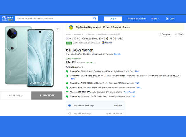 ভিভো ভি40 5জি ফোনের 8GB+128GB স্টোরেজ মডেলটি 34,999 টাকায় লঞ্চ হয়েছিল। শপিং সাইট Flipkart এর তরফে এই মোবাইল ফোনে 2000 টাকা পর্যন্ত ছাড় দেওয়া হচ্ছে। এই অফারটি যেকোনো ব্যাঙ্কের ক্রেডিট কার্ড EMI পেমেন্টে পাওয়া যাবে। যার পরে ফোনের দাম কমে 32,999 টাকা হয় যাবে।