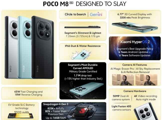 ফিচারের কথা বললে, পোকো এম8 5জি ফোনটি 6.77-ইঞ্চি FHD+ ডিসপ্লে সহ আসে যা 120Hz পর্যন্ত এডাপ্টিভ রিফ্রেশ রেট অফার করে। এছাড়া এতে 240Hz টাচ স্যাম্পলিং রেটও পাওয়া যাবে। ব্রাইটনেস হিসেবে এটি 3200 নিট পিক পর্যন্ত সাপোর্ট করে।