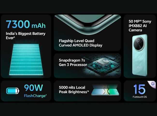 ফোনের সবচেয়ে বিশেষ দিক হলো এর বড় ব্যাটারি, যেখানে 7300mAh এর বড় ব্যাটারি রয়েছে। ভিভো টি৪ ৫জি ফোনে শক্তিশালী Snapdragon 7s gen3 5G প্রসেসরও পাওয়া যাবে, যা এই ফোনকে আরও শক্তিশালী করে তুলবে। 90W ফাস্ট চার্জিং, রিভার্স চার্জিং এবং বাইপাস চার্জিংয়ের মতো ফিচারও ফোনে দেওয়া হয়েছে।