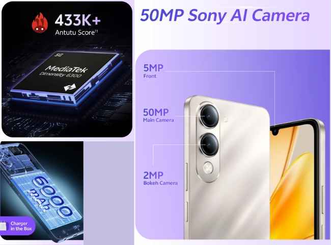 ভিভো টি৪ লাইট ফোনটি 10 হাজার টাকার কম দামে আসে যা 6000mAh ব্যাটারি, মিডিয়াটেক ডাইমেনসিটি 6300 চিপসেট অফার করে