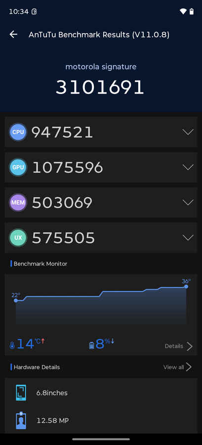 Battery life is where the gap becomes obvious. The Motorola Signature’s 5,200mAh battery lasts comfortably over a full day and can stretch to a day and a half with moderate use. In the PC Mark battery test, the Signature lasted 16 hours and 4 minutes.