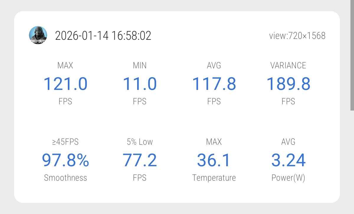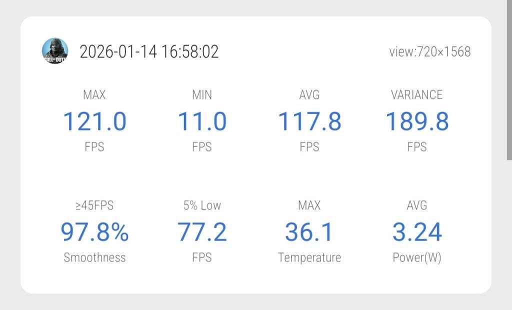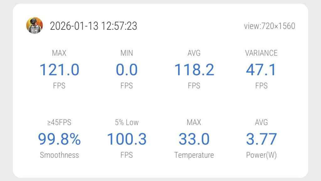 In a Classic match lasting around 30 minutes, stability was still strong. The phone held an average of 118.2 FPS, and even after extended gameplay, heating remained under control at under 33°C.
