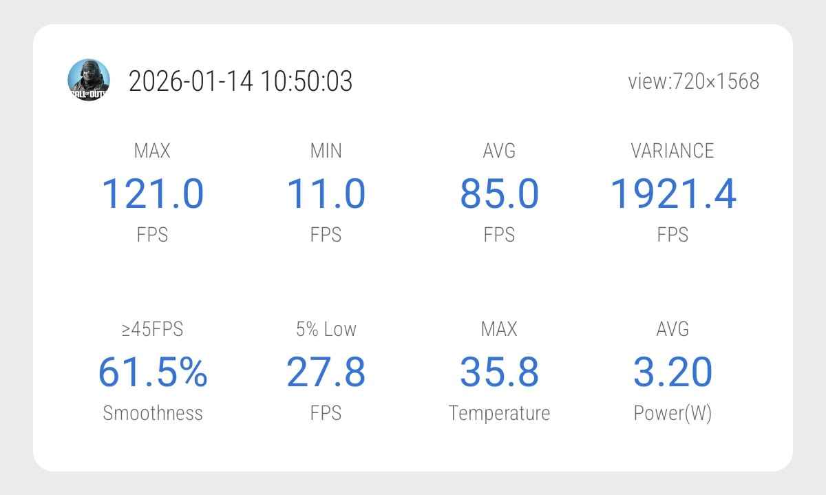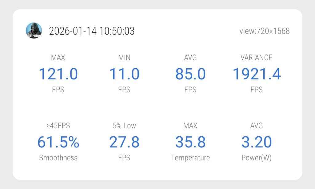 In TDM matches, gameplay FPS averaged around 119 FPS during actual play. However, the overall logged average came in at 85 FPS. This happens because the phone drops FPS during loading screens and menu transitions after each match. Since multiple matches were played back-to-back, those dips pulled the total average down.