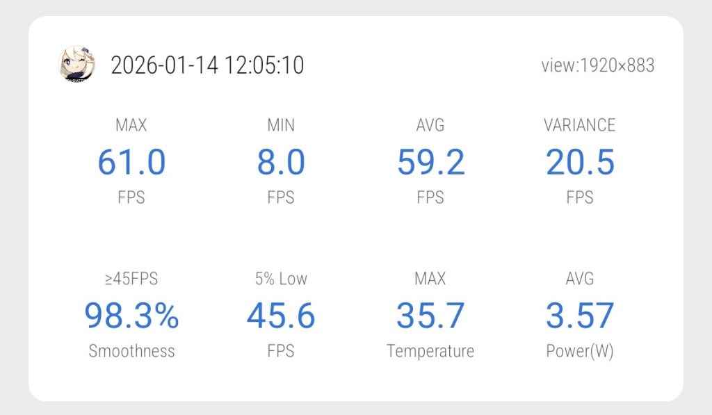 Thermals also stayed controlled. The maximum recorded temperature during gameplay was 35.7°C, which is a strong result for sustained Genshin sessions.