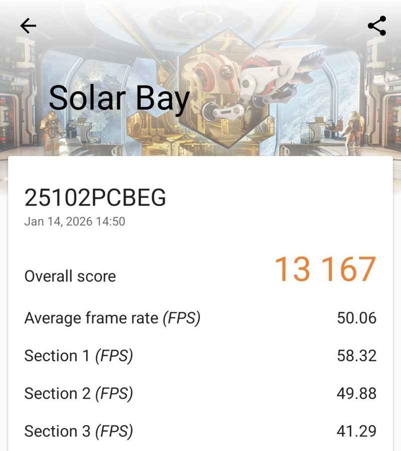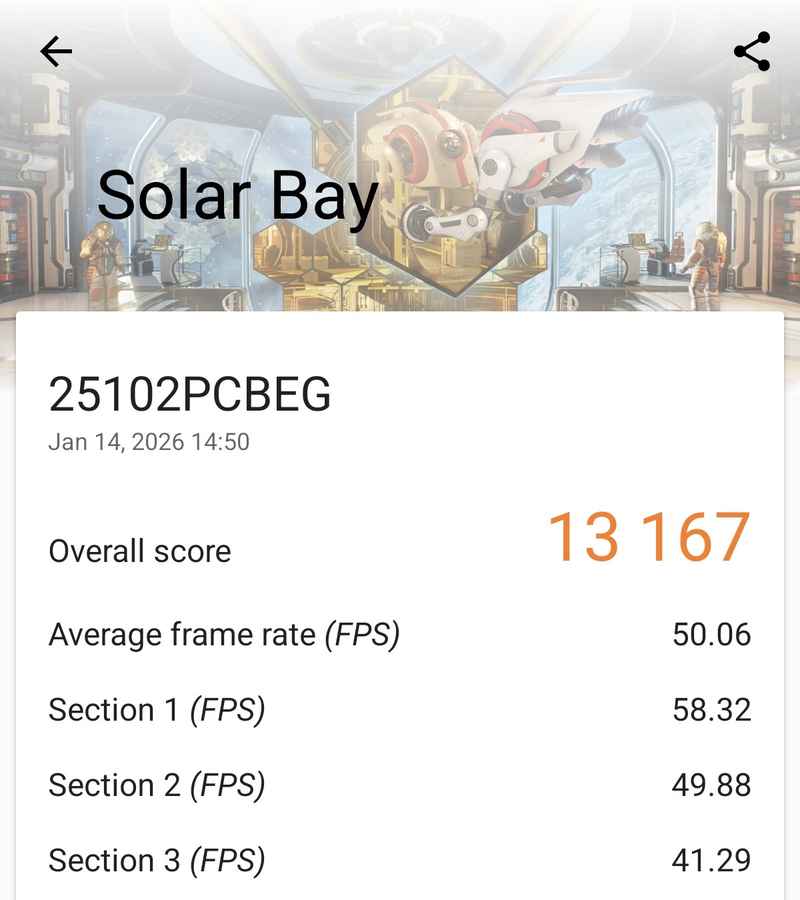 GPU performance is where the Poco F8 Ultra really starts to flex. In stress-heavy benchmarks like Wild Life Extreme, Steel Nomad, and Solar Bay, it delivered scores of 7,160, 2,967, and 13,167, respectively. These results show strong graphical headroom along with decent stability. More importantly, those numbers translate well into real-world use, with the phone holding up comfortably during demanding gaming sessions and extended GPU loads.