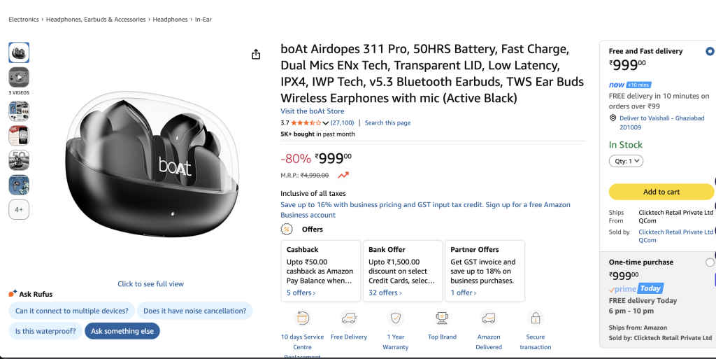The Boat Airdopes 311 Pro cater to the ultra-budget segment, where brand familiarity and battery life tend to matter more than advanced features. Despite the “Pro” branding, this model keeps things simple. The 10mm drivers are smaller than the others on this list, which may affect loudness and bass depth, but are still adequate for casual listening.