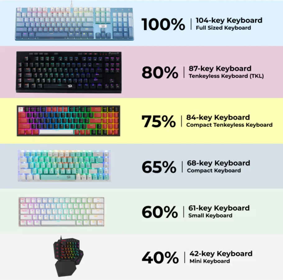 • Full-Size (100%): This is the traditional keyboard layout that includes a number pad, function row, and navigation keys. It’s great for productivity and data entry but takes up the most desk space.