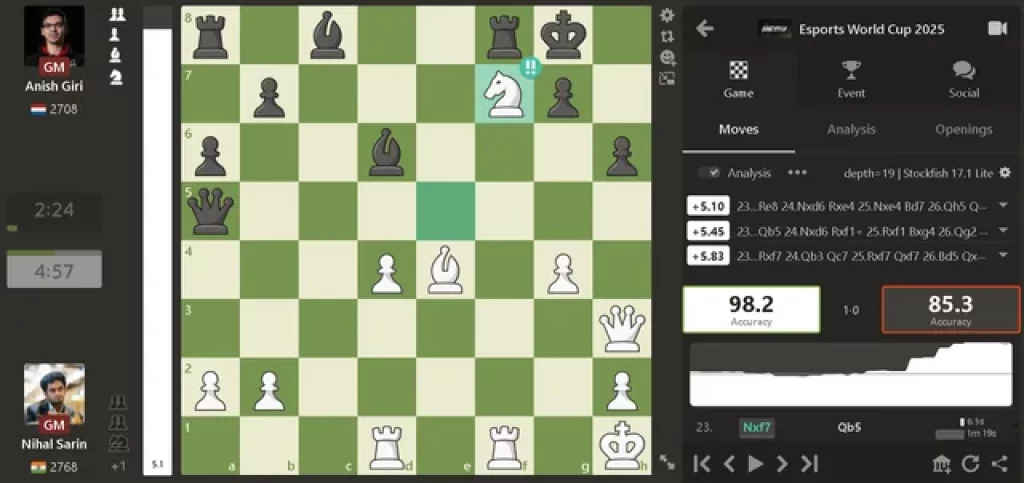 The path to the Esports World Cup 2025 was anything but easy. The Last Chance Qualifier, held in Riyadh, was a high-stakes double-elimination knockout tournament that brought together some of the world’s top grandmasters, all vying for just four coveted spots in the $1.5 million main chess event. Nihal dominated the winner’s bracket with a series of commanding performances. He opened with a stunning victory over GM Denis Lazavik, recovering from a seemingly lost position with a brilliant display of creative tactics. His most memorable triumph came against superstar GM Anish Giri, where Nihal executed a spectacular 23.Nxf7!! sacrifice that left chess enthusiasts and analysts in awe. In the decisive best-of-four match against GM Andrey Esipenko, Nihal held his nerve through tense endgames and lightning-paced blitz finishes, clinching a 2.5-1.5 victory to secure his place in the main event. His ability to thrive under pressure, particularly in rapid and blitz formats, underscored his readiness for the global stage.