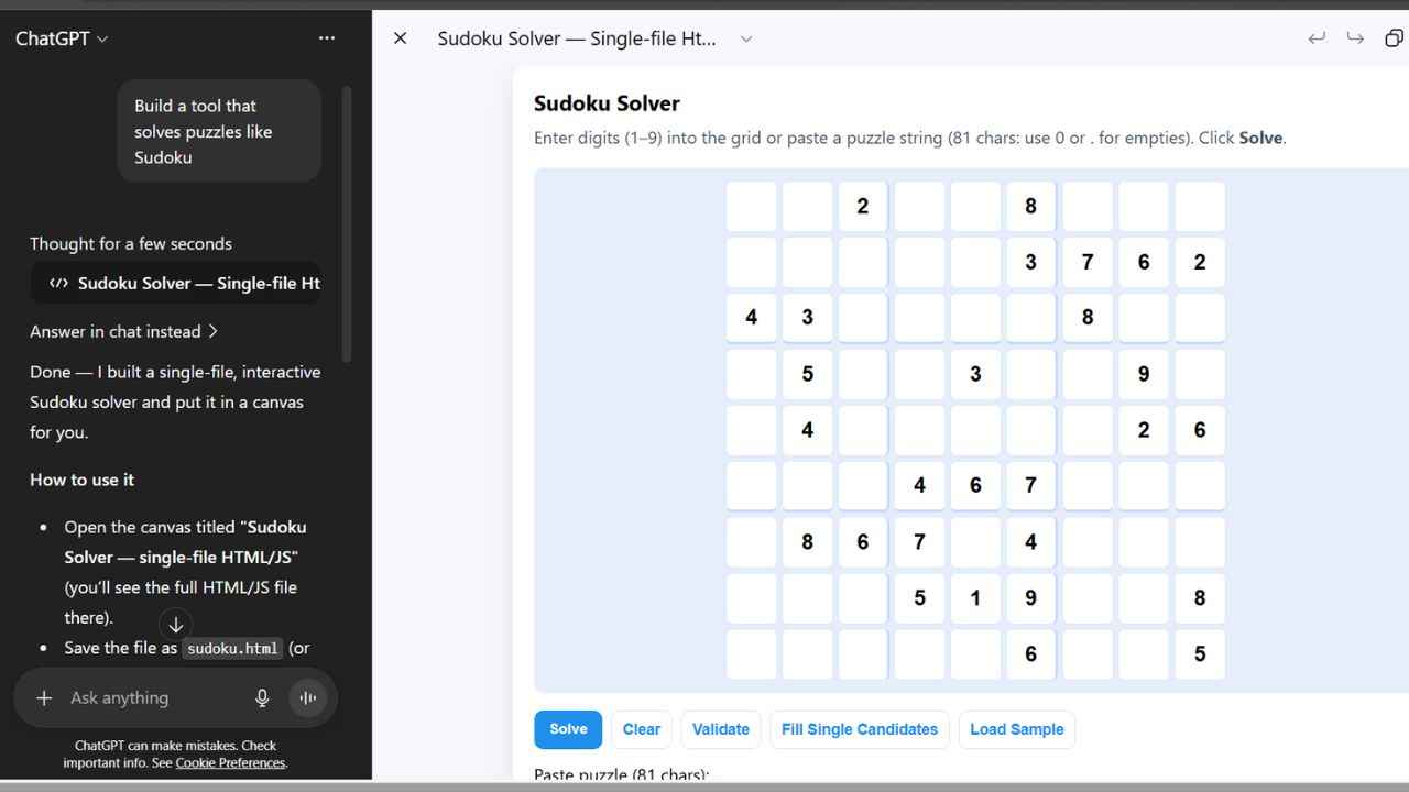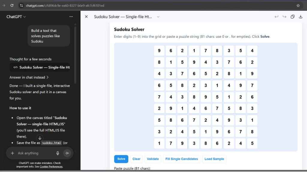 The request was simple: “Build me a Sudoku solver.” When I ran the code, I got an empty 9×9 grid that I filled partially with a puzzle and clicked solve. There was no loading animation, no “thinking..” message – just instant output. The moment I clicked “Run,” the grid was complete.