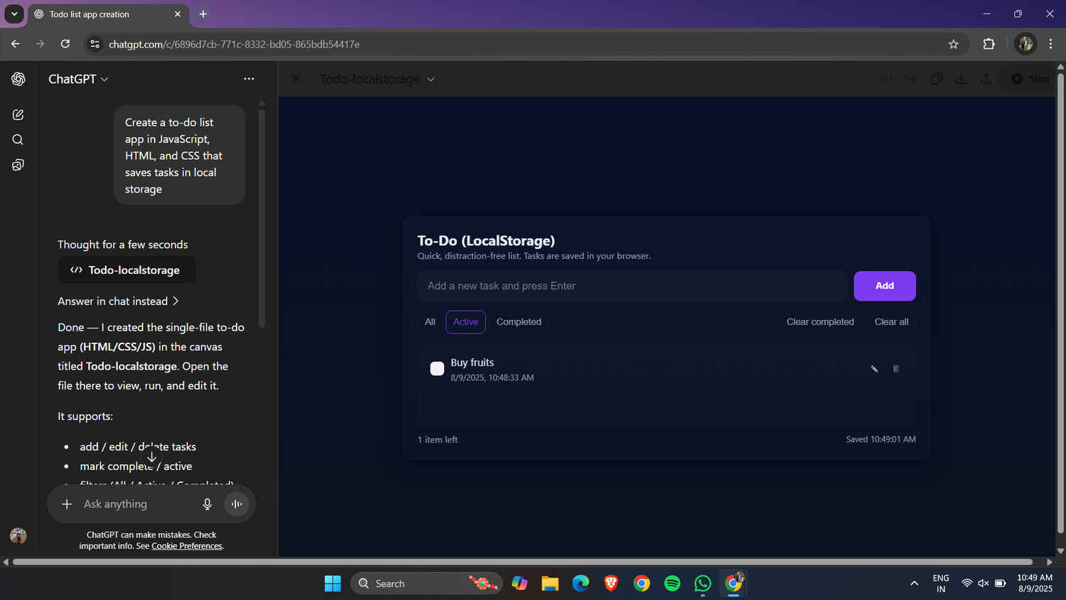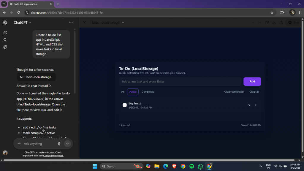 For the third challenge, I decided to go practical: a to-do list web app that stores tasks in local storage so they don’t disappear when you close the browser. GPT-5 gave me exactly that, sort of. I got a clean, minimal interface where I could add and delete tasks instantly. Tasks stayed saved even after refreshing or closing the tab.