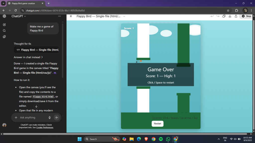 No extra debugging unless the project was completely broken. No sugar-coating. Just pure “here’s what the AI gave me.” By the end of it, I had learned three things: GPT-5 works fast, thinks ahead (sometimes more than I asked), and is apparently better at Flappy Bird than I will ever be.