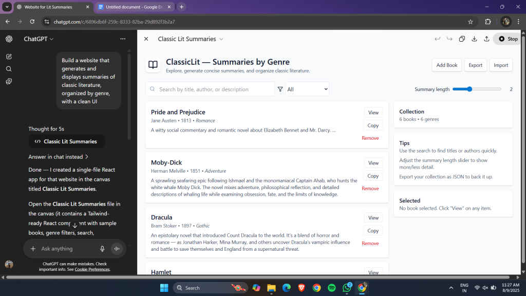 GPT-5 came back with a React app called ClassicLit – a minimalist interface with a search bar, genre filter, adjustable summary length, and buttons to add, export, and import books.