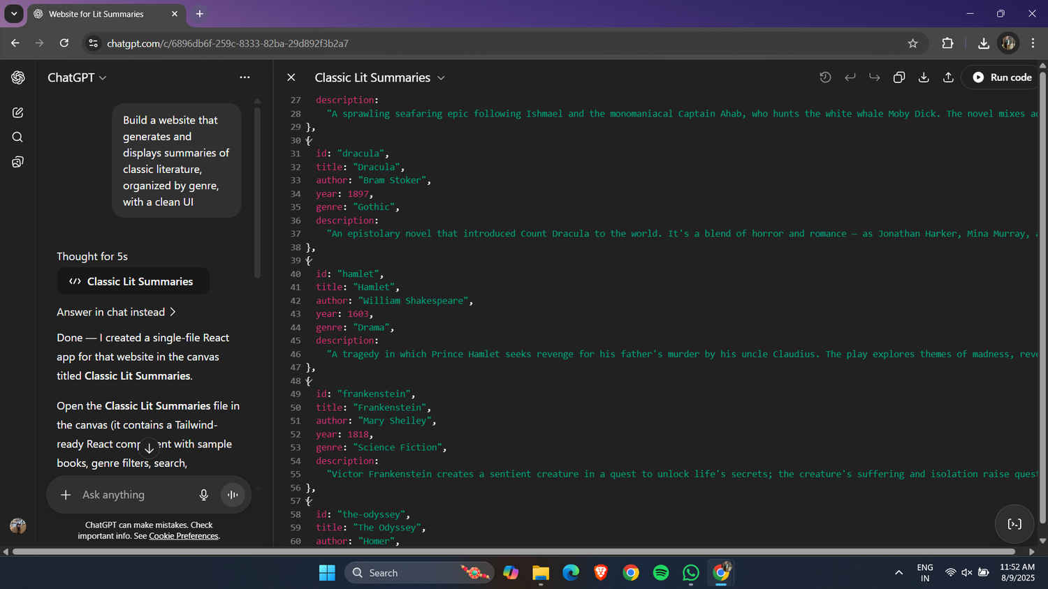 This one started with a simple request: “Build a website that generates and displays summaries of classic literature, organized by genre, with a clean UI.”
