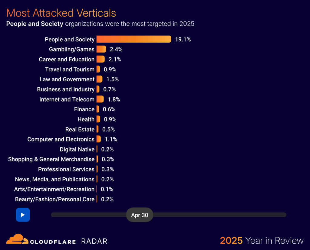 For the first time, civil society and non-profit organizations became the number one target for cyberattacks globally. Fueled by emerging threats like the massive Aisuru botnet, attackers unleashed record-breaking “hyper-volumetric” DDoS strikes. The motivation has moved from financial extortion to geopolitical suppression, with cyber weapons increasingly used to silence dissent and disrupt humanitarian aid rather than just steal data.