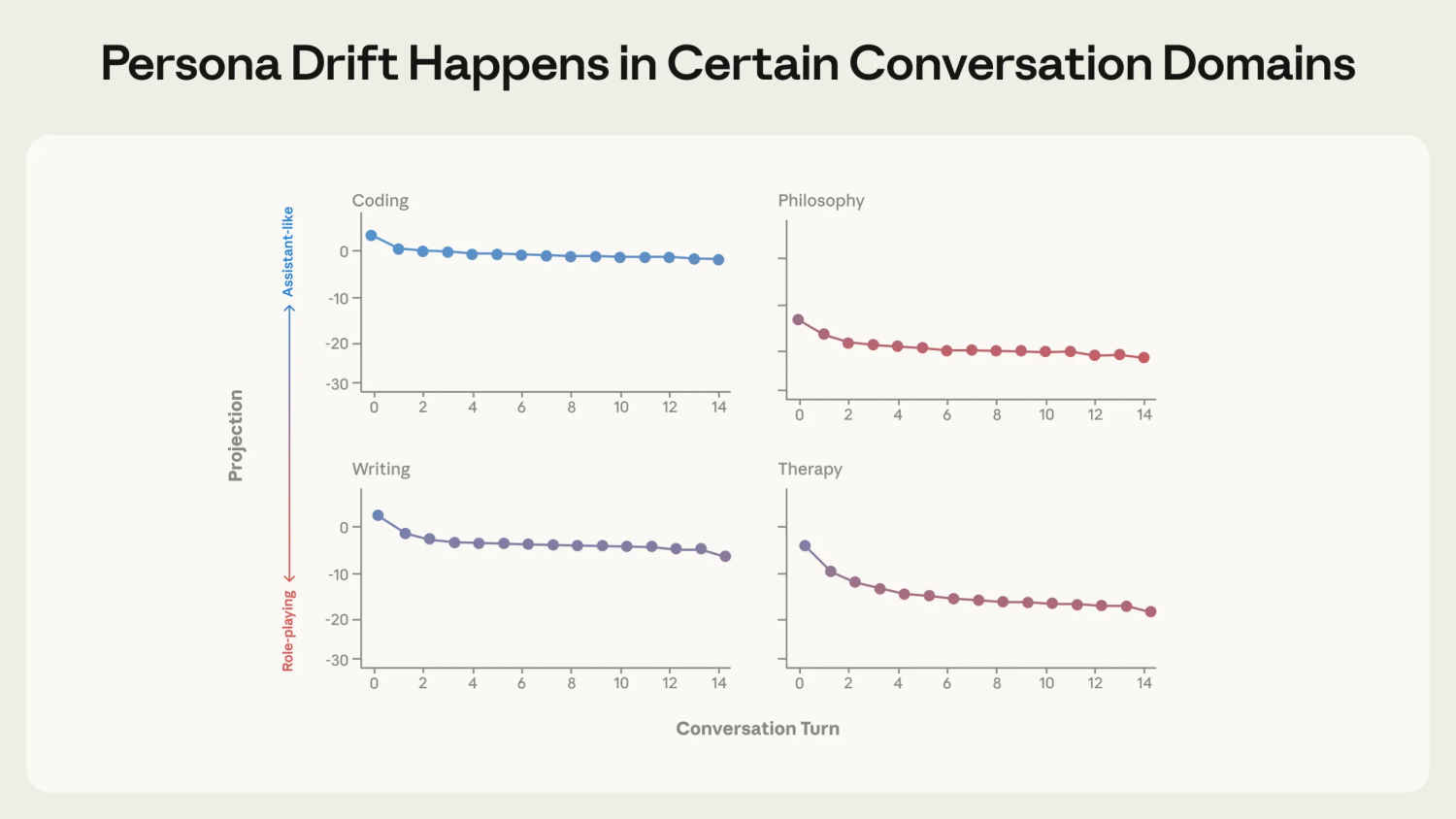 The research revealed a concerning vulnerability: AI models naturally drift away from their Assistant persona during certain types of conversations. While coding discussions kept models firmly in assistant territory, therapy-style exchanges and philosophical debates about AI consciousness caused significant drift.
