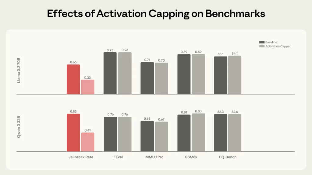 The results proved effective. Activation capping reduced harmful response rates by approximately 50% across 1,100 jailbreak attempts spanning 44 harm categories, all while preserving performance on capability benchmarks. When tested against persona-based jailbreaks, prompts designed to make models adopt harmful characters, the technique successfully kept models grounded in their helpful assistant role.