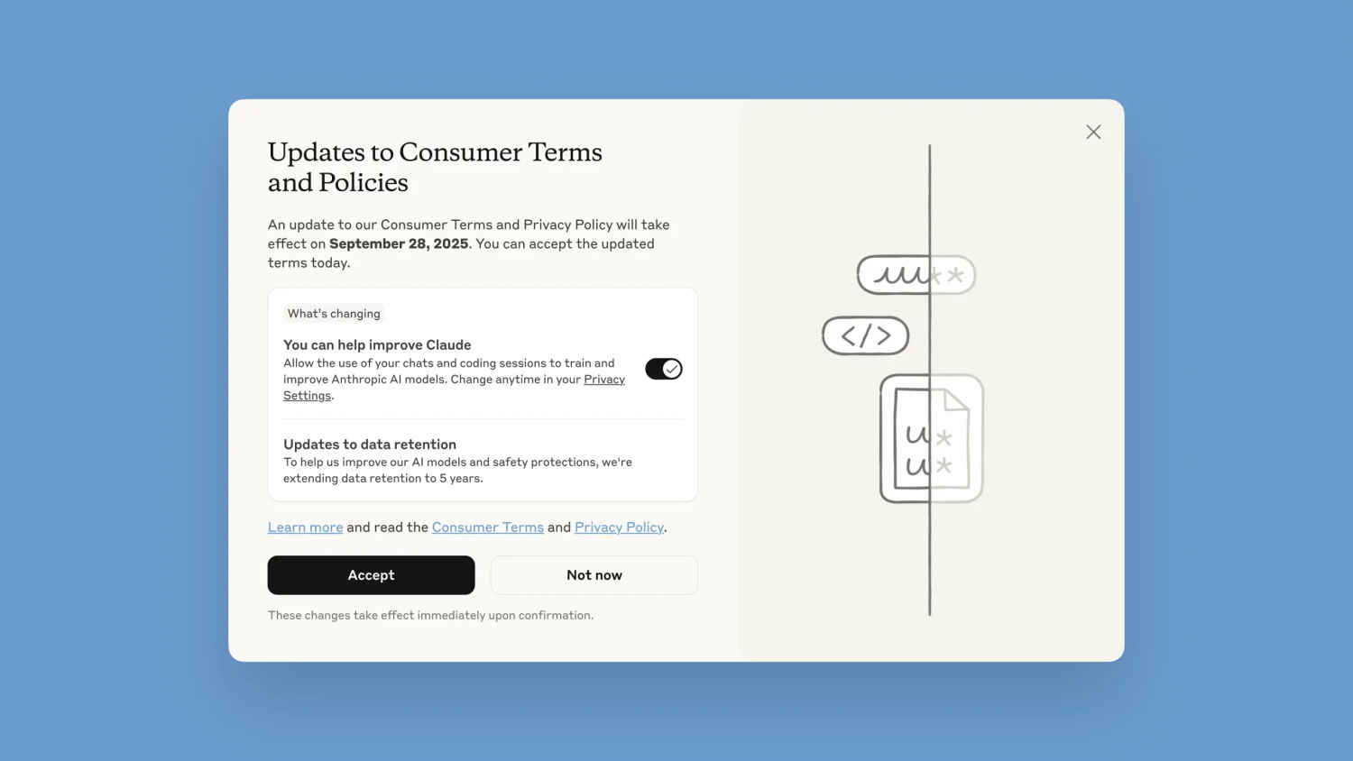 When users log into Claude today, they see a large popup titled “Updates to Consumer Terms and Policies.” At first glance, the layout looks straightforward: a bold “Accept” button dominates the screen. But the crucial toggle that determines whether your data feeds into Claude’s training pipeline is smaller, placed beneath, and switched on by default.