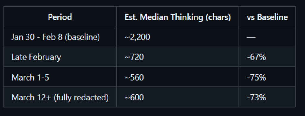 The 67% figure came from getting Claude to analyse its own session logs to measure how much it was thinking. The problem was that Anthropic had introduced a header called redact-thinking-2026-02-12 that hides Claude’s reasoning from the UI and from stored transcripts. Claude, reviewing its own logs, saw no thinking blocks and reached the conclusion that it had stopped thinking. It was essentially reading its own diary and finding blank pages, not because nothing happened, but because someone had used invisible ink.
