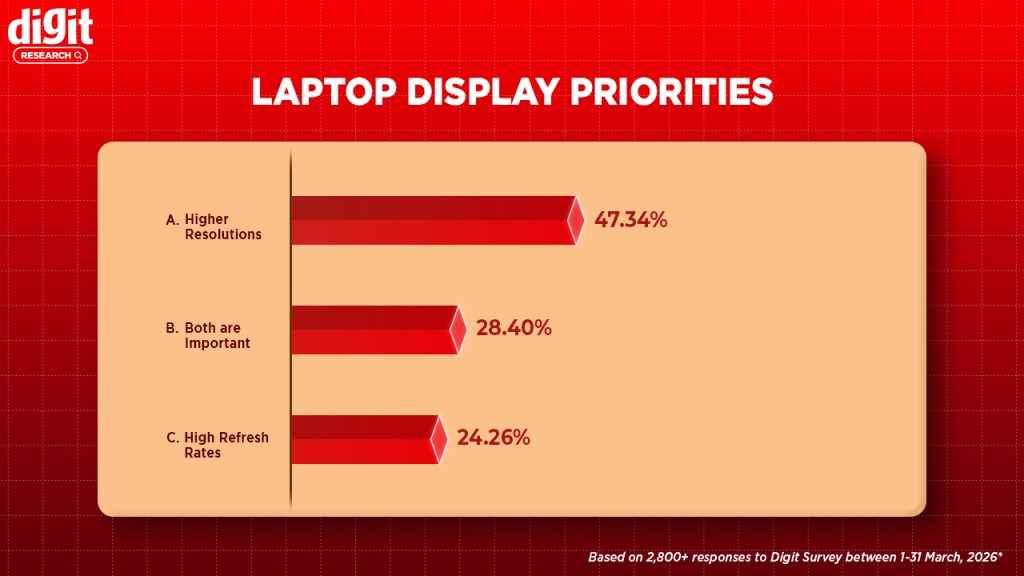 Close to 48% of respondents from our survey suggested they need a screen with high resolution when buying a new laptop. Full HD 1080p panels have been around for a long time now; they became the standard back in the early 2010s. So it does make sense that now, in 2026, users would want to upgrade to screens with higher resolution.
