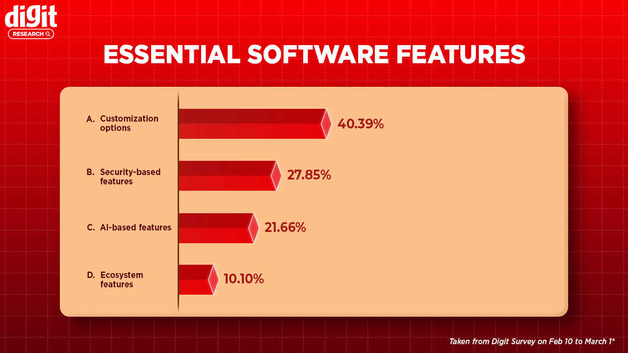 This indicates that for many, a functional and beautiful software experience remains more essential than the latest AI features. Surprisingly, over 27% of users picked security-based features next, followed by ecosystem-based features that stood at around 10%.