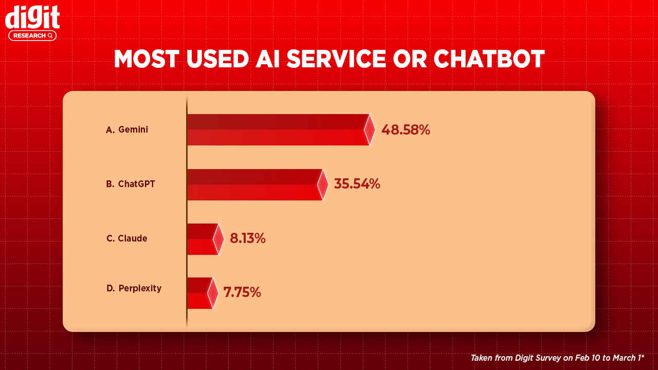 The reason behind this could be because of how Gemini’s integration into the Android ecosystem is making it more accessible to users. It went on to outperform ChatGPT, which came close as it was the next most picked option. But safe to say, in the battle of these two chatbots, Claude and Perplexity are trailing significantly.