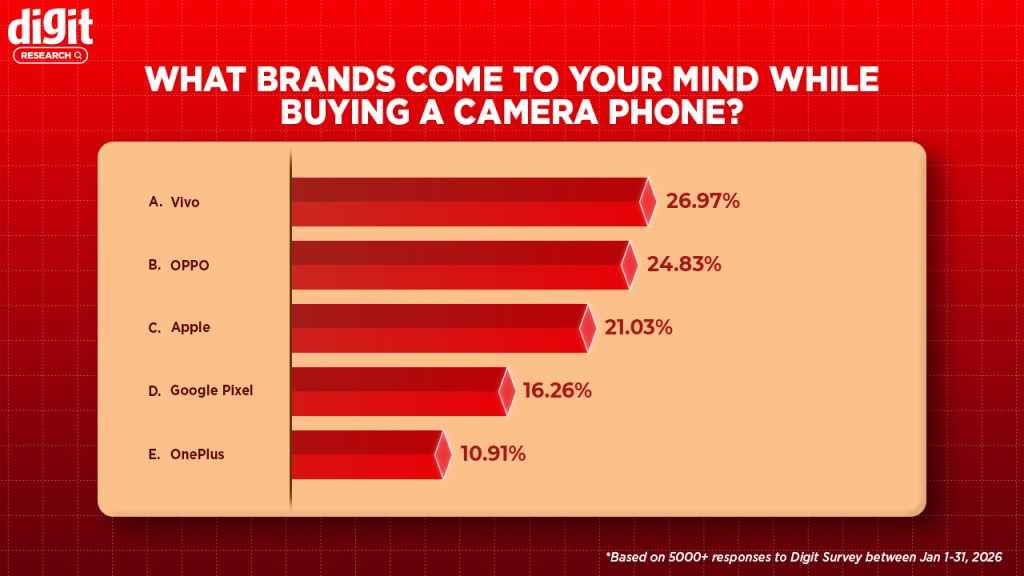 While Apple and Samsung have historically been the preferred choices for camera smartphones, there seems to be a shift in consumer mindset. More and more smartphone users now prefer Vivo and Oppo. As per a recent survey conducted by Digit, more than 26 per cent of participants opted for Vivo as the first brand they think of when it comes to cameras. Oppo was closely followed by nearly 25 per cent of the votes.