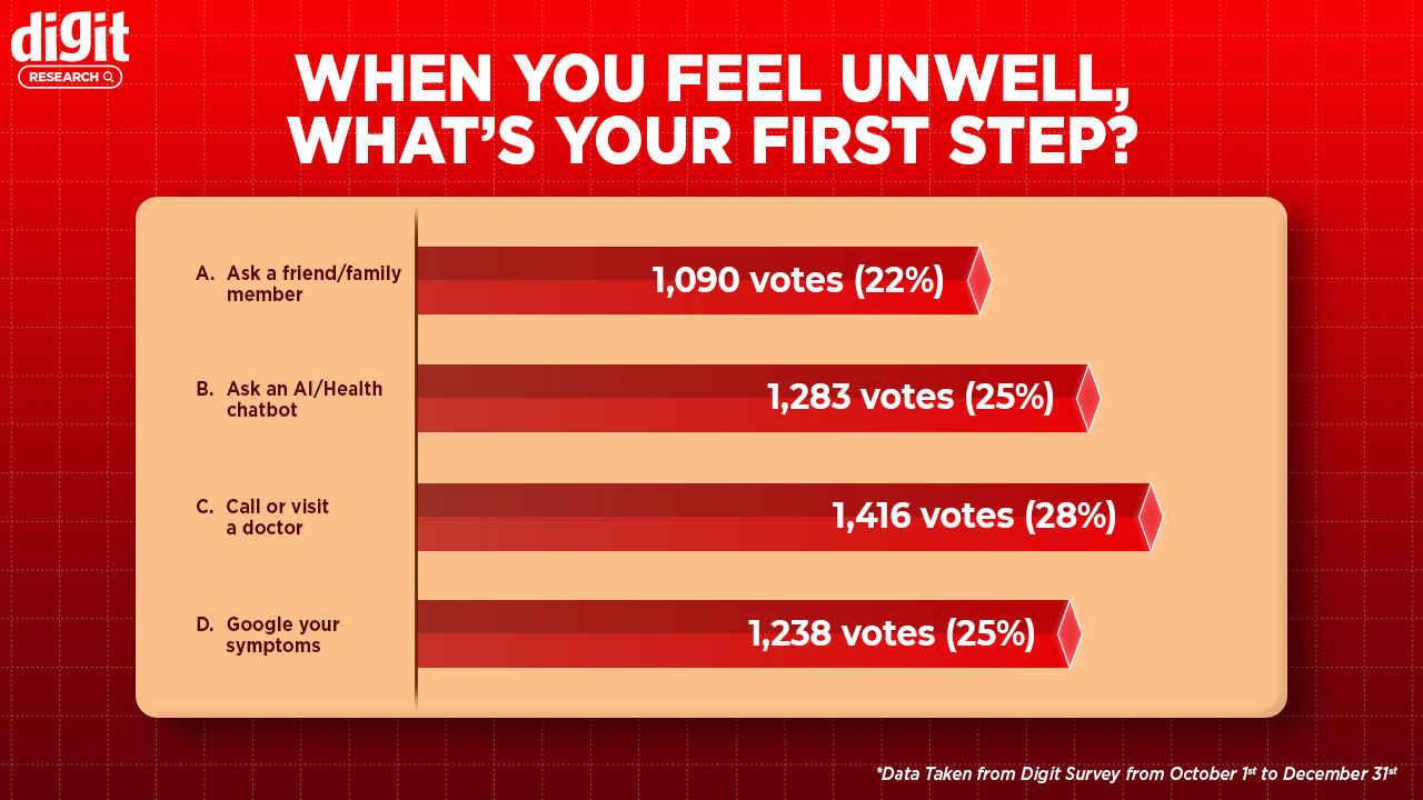 Just like our previous Digit Research report, our question to the readers was pretty simple: When you feel unwell, what’s your first step? This question was pretty straightforward, and that was important, as we wanted to understand exactly what the readers would do as their first step.