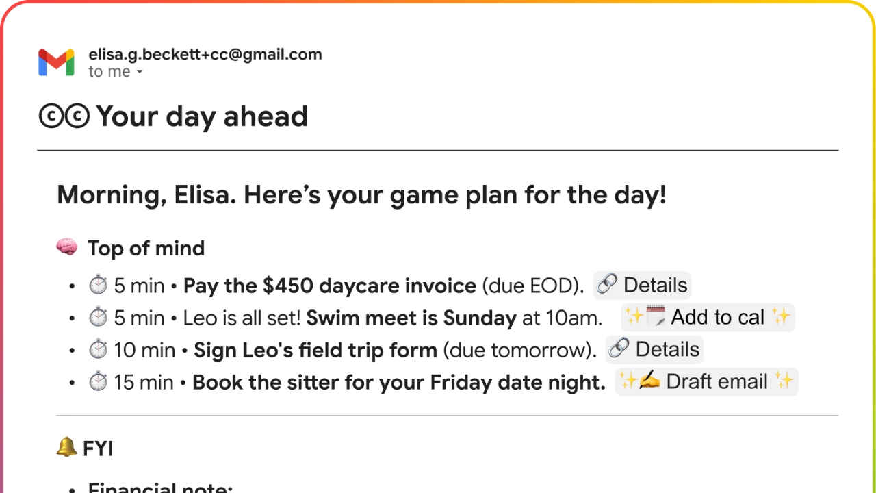 Google plans to expand CC’s functionality based on early user feedback. Currently, it focuses on delivering clear, quick “Your Day Ahead” email summaries of key information from emails, events, tasks, and web data powered by Gemini models.
