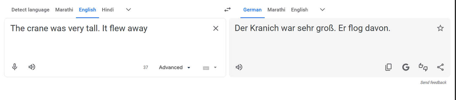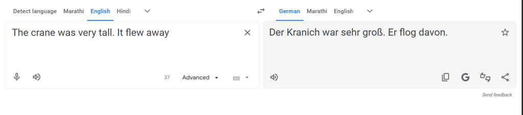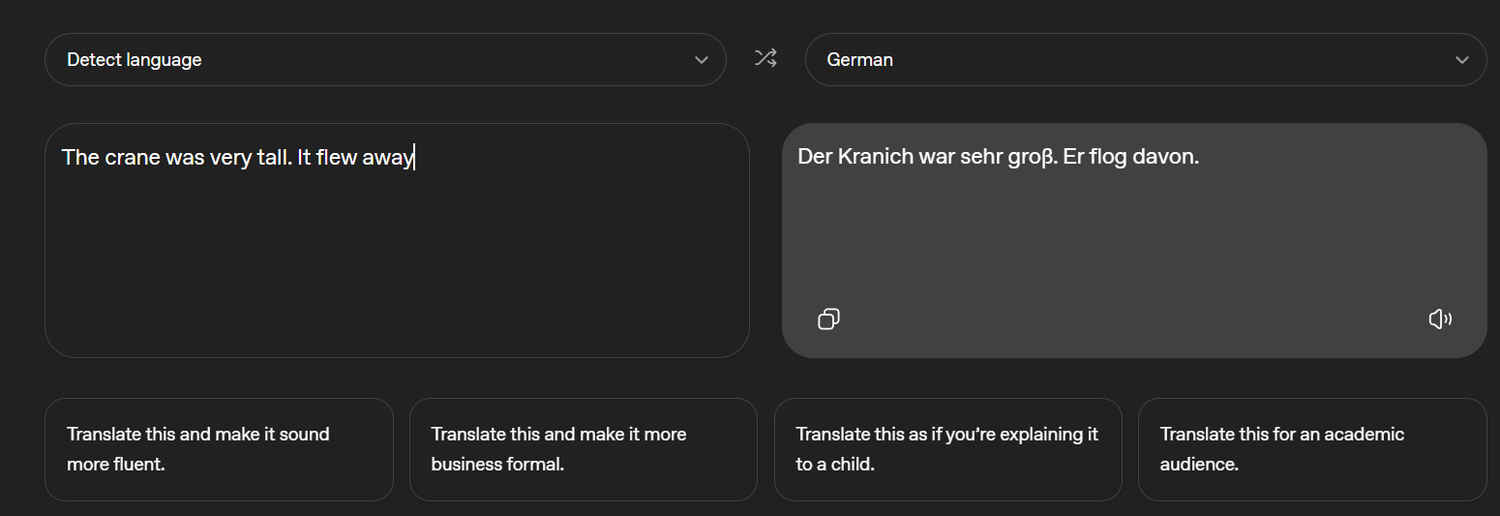 Five years ago, Google might have translated the first sentence as a construction machine and the second as a bird action. Today? Both ChatGPT and Google Translate correctly identified the subject as Der Kranich (the bird) in German. Google’s Neural Machine Translation (NMT) has evolved. It no longer translates in isolation; it now employs a “context window,” effectively closing the gap in raw logic.