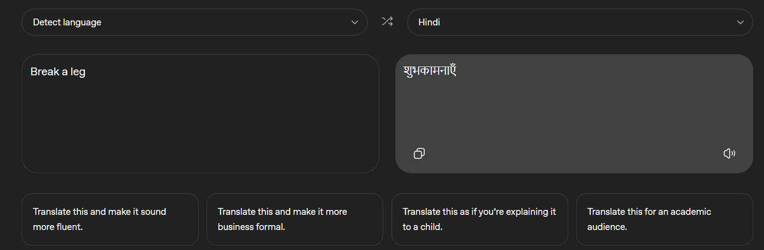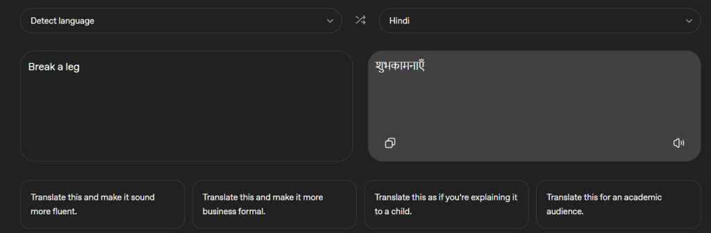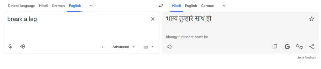 We tested the idiom “Break a leg” (a theatrical wish for good luck) into Hindi.