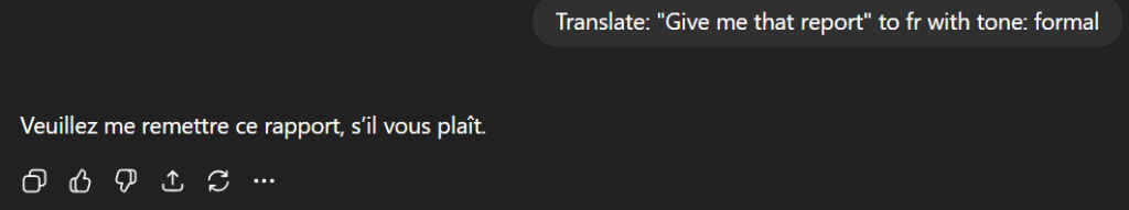 - ChatGPT, when prompted for a formal tone, provided “Veuillez me remettre ce rapport” – a formal, polite request.