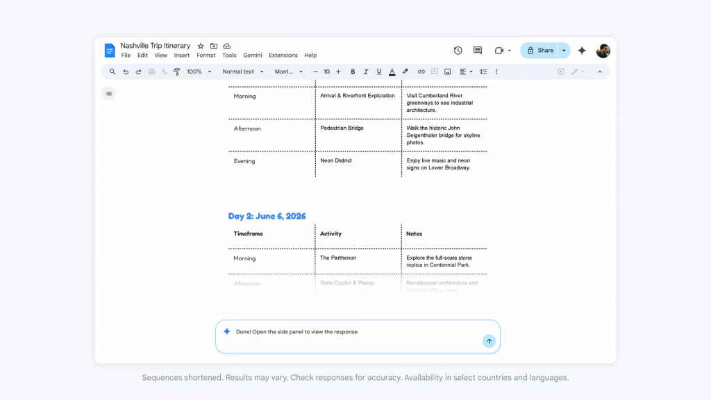 Gemini in Docs now includes two editing tools that solve a surprisingly common headache. “Match writing style” unifies the tone and voice across a document so it sounds consistent throughout. “Match doc format” reformats your content to mirror a reference document, paste in a travel itinerary template you like and Gemini will populate it with your actual trip details from your emails.