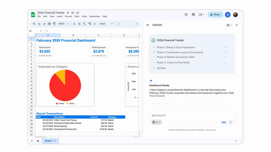 Gemini in Sheets has levelled up significantly. Describe your project and it builds the entire spreadsheet for you, including tables, dashboards and structure. The new “Fill with Gemini” feature is particularly useful. You can highlight a column, and Gemini populates it with categorised, summarised or web-sourced data without you ever lifting a finger.