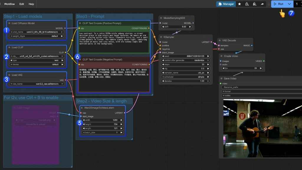 - Enter your text prompt in the workflow. Be descriptive: “a cinematic shot of a knight riding into a misty forest, 4K film grain”.