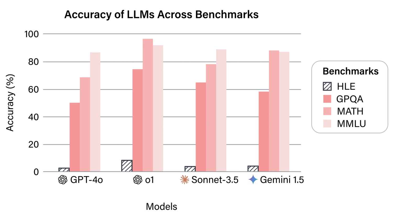 Compare this to older benchmarks like MMLU, where top AI models regularly exceed 90% accuracy, and you can see just how much harder HLE is.