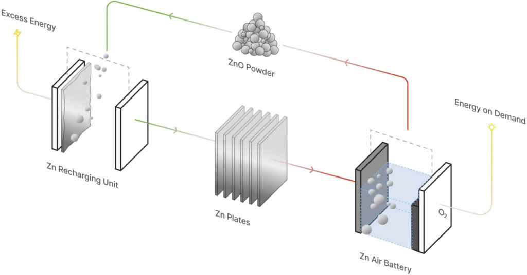 The way their system works is quite elegant. When you have excess energy, you use it to electrochemically produce metallic zinc from zinc oxide. The metallic zinc remains stable in a plate form for months and months without any kind of degradation. Whenever you want the energy back, you run the zinc through a zinc air battery that reacts with ambient air and a water based electrolyte to release the stored energy. Then the zinc converts to zinc oxide again and you can use it all over again.