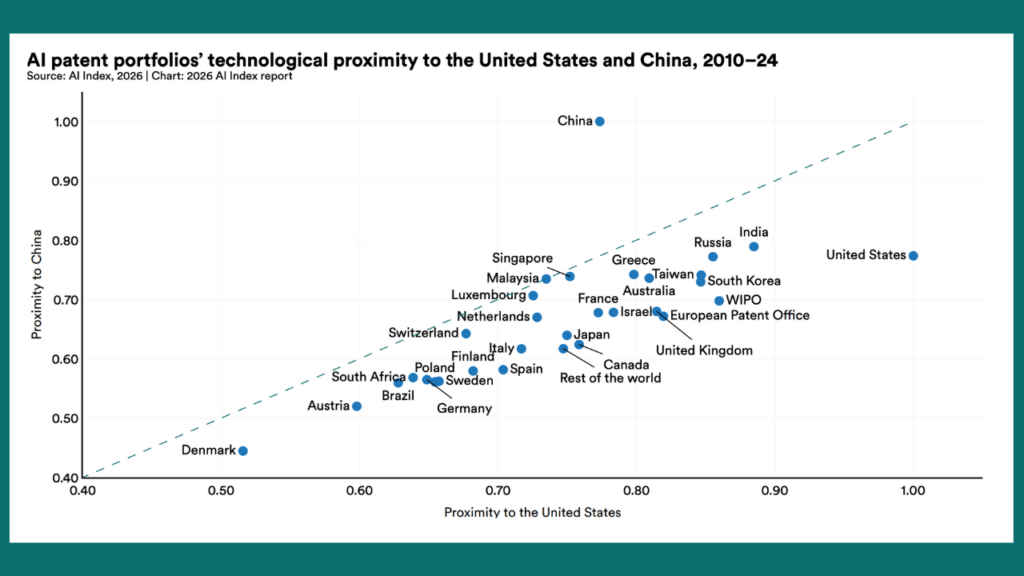 In terms of patents, this is where a lot of work needs to be done in India. The AI Index 2026 suggests India’s share of global AI patents is miniscule at just 0.4% which represents just over 500 patents till 2024. But India’s portfolio of patents shows roughly 80% overlap with the US and China. This means India is innovating in the same AI domains as the US and China, not doing anything drastically different.