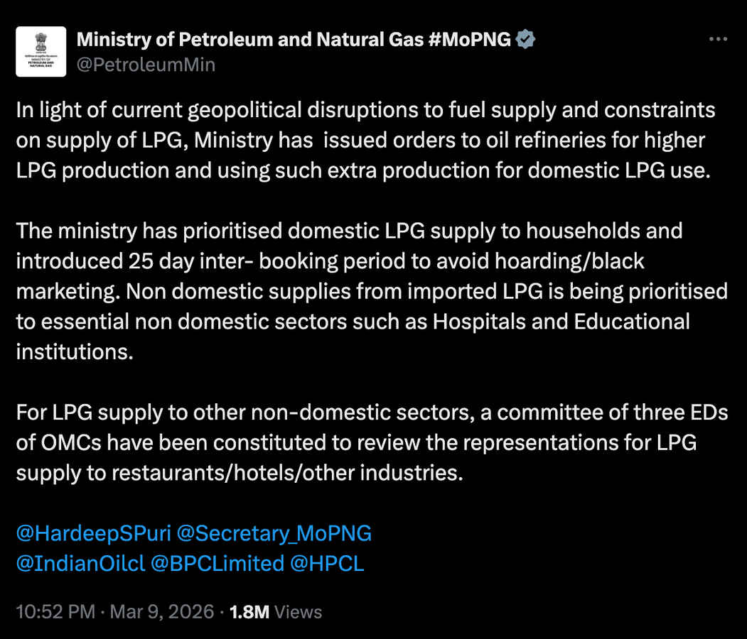 The immediate cause is the escalation of geopolitical tensions in West Asia, which disrupted shipping routes used for transporting LPG and other energy products.