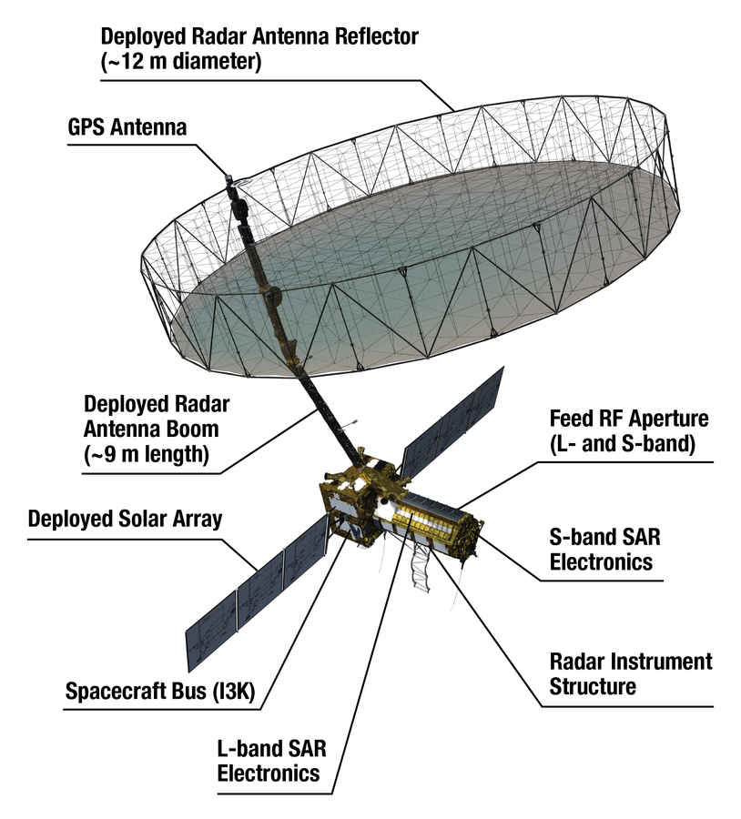 At the heart of NISAR lies its dual-frequency Synthetic Aperture Radar (SAR) – a first in space history. Developed through a collaboration between NASA’s Jet Propulsion Laboratory and ISRO, the satellite carries both L-band (1.25GHz) and S-band (3.2GHz) radar systems. These operate together using a 12-meter-wide mesh reflector antenna which is roughly the size of a tennis court.