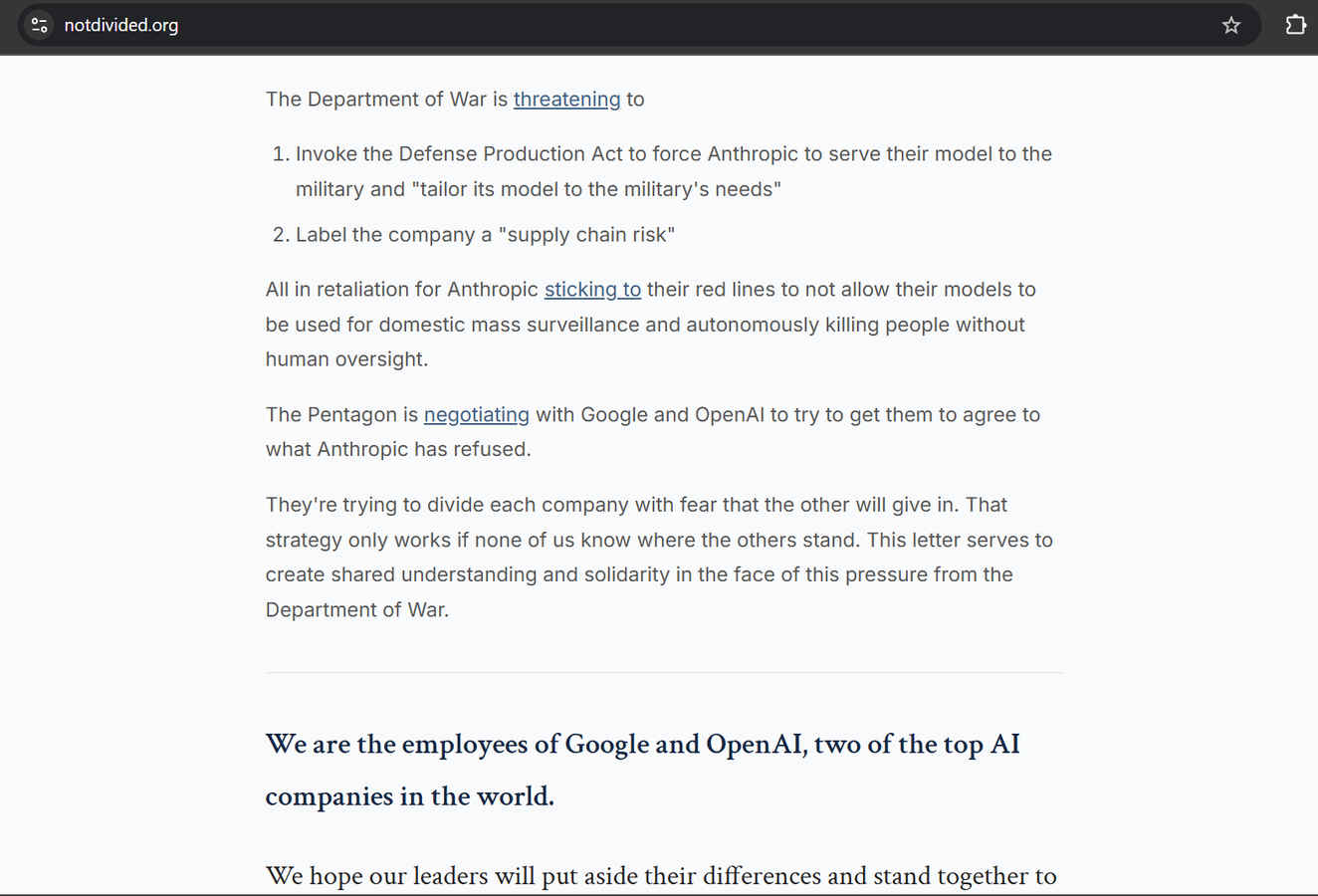 The letter’s authors understood exactly what was happening. “They’re trying to divide each company with fear that the other will give in,” it reads. “That strategy only works if none of us know where the others stand.” The “they” in question is the Department of War. And the strategy it describes – divide, pressure, conquer – is precisely what the DoW attempted when it went after Anthropic.