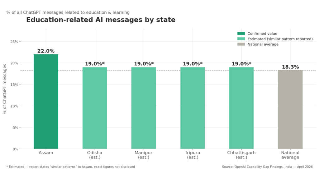 For example, in Assam, 22% of all ChatGPT messages relate to education and learning — about 20% above the national average, according to the OpenAI report. States like Odisha, Manipur, Tripura, and Chhattisgarh show similar patterns, which suggests that eastern India is leaning heavily on AI as an educational resource in ways urban India isn’t.