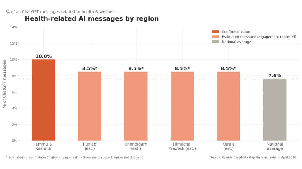 In Jammu & Kashmir, nearly 1 in 10 ChatGPT messages relates to health and wellness, which is roughly 32% above the national average. Other states like Punjab, Chandigarh, Himachal Pradesh, and Kerala also showed higher-than-average health-related engagement with ChatGPT, based on the OpenAI report.