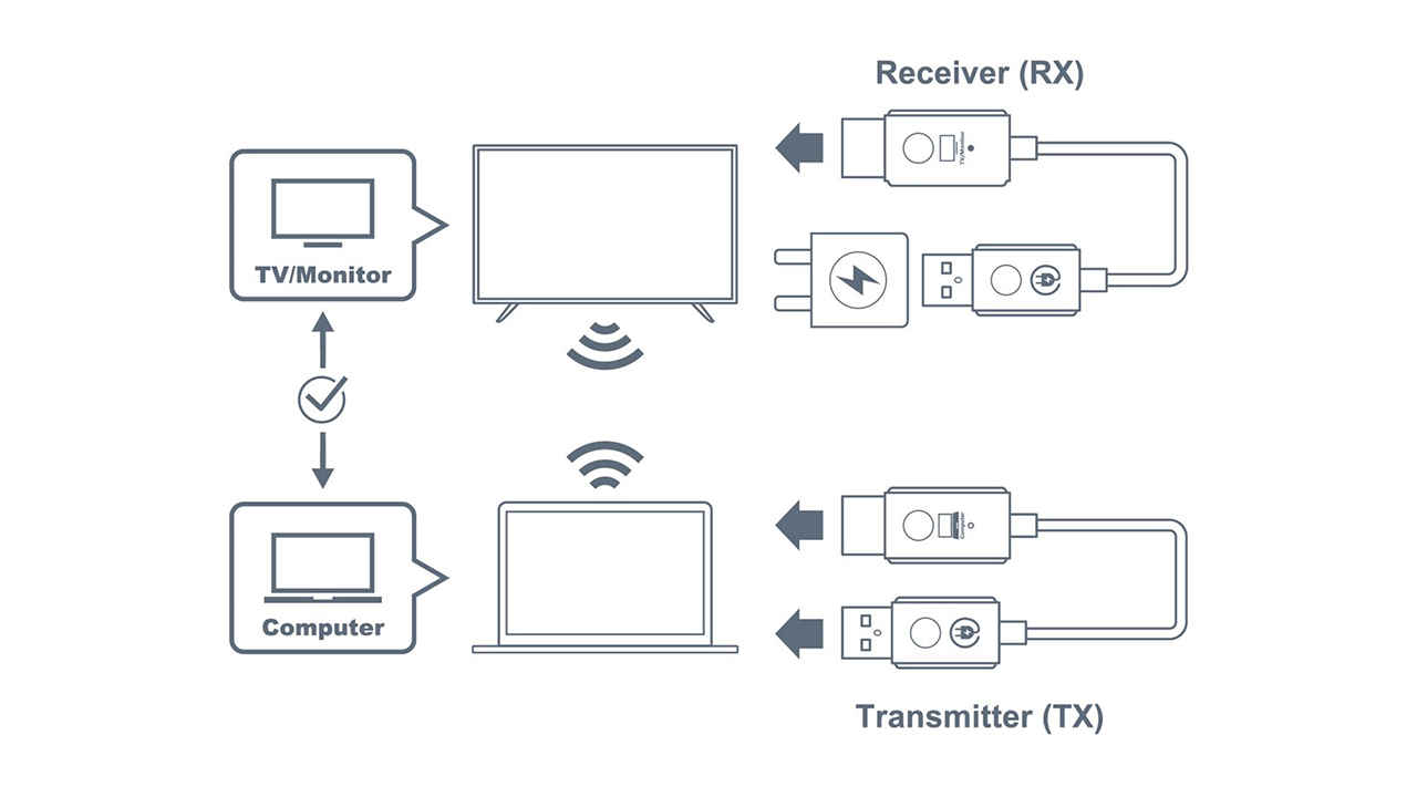 The WHD211 is the HDMI-first kit. Its transmitter takes one HDMI input and USB-A for power. The receiver outputs HDMI to a TV, monitor, or projector, and also takes USB-A power. It’s the natural choice for anything that already speaks HDMI: laptops with HDMI ports, desktops, cameras, set-top boxes, Blu-ray players, and consoles.